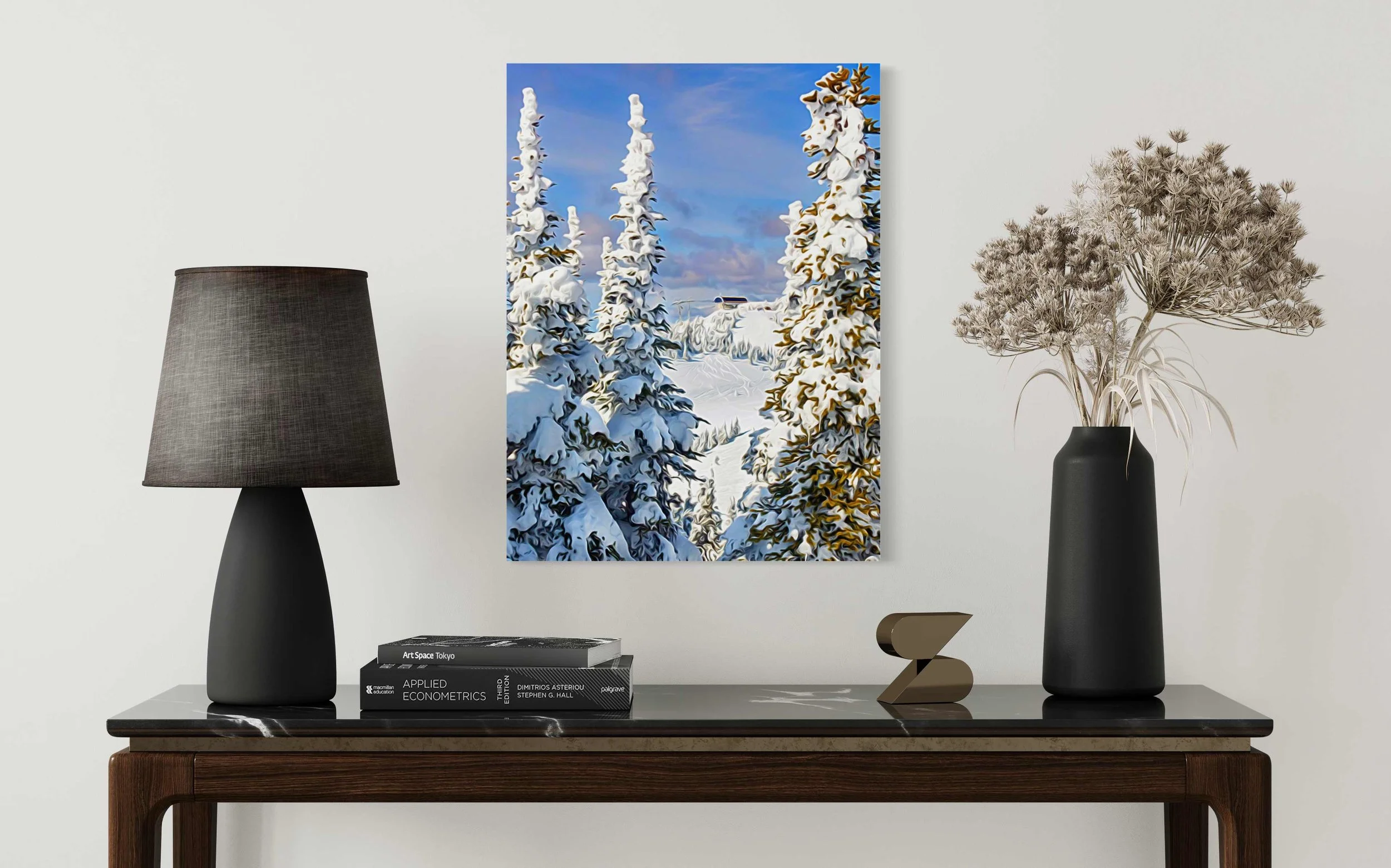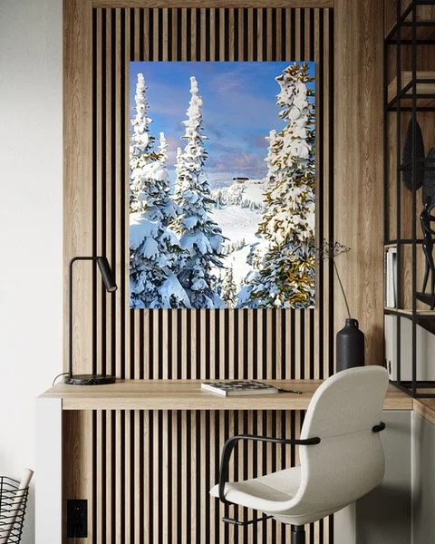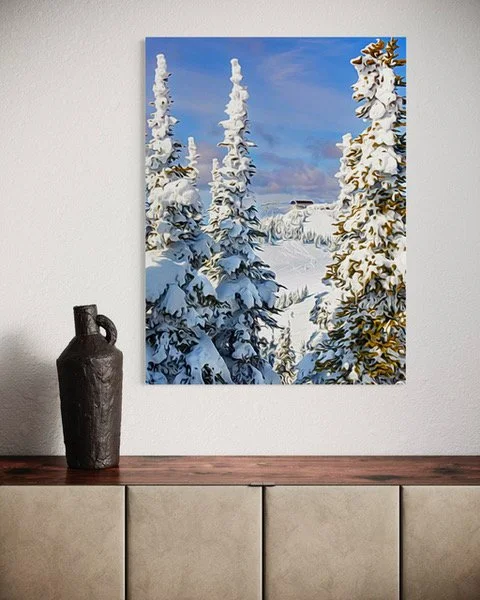'“Westbowl Gateway” - At Sun Peaks Resort, from the top of Crystal Chair, my gaze drifts across the mountain to West Bowl Chair, standing quietly through the snow-laden pines. In that moment, the world feels hushed and expansive—blue sky above, winter holding everything in stillness. West Bowl becomes a gateway, inviting possibility and the promise of what lies beyond. This piece reflects the relationship between place, elevation, and pause within the mountain landscape.