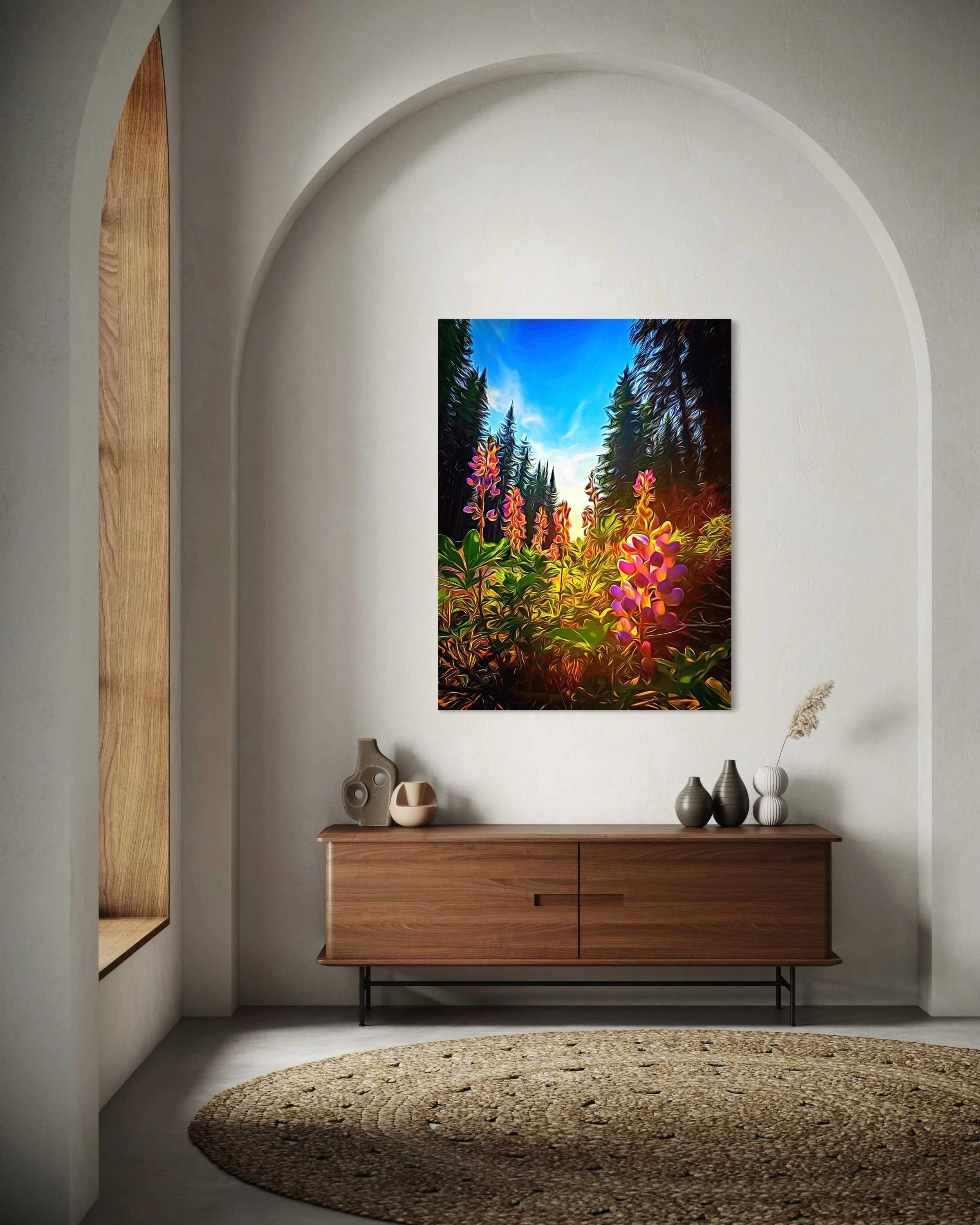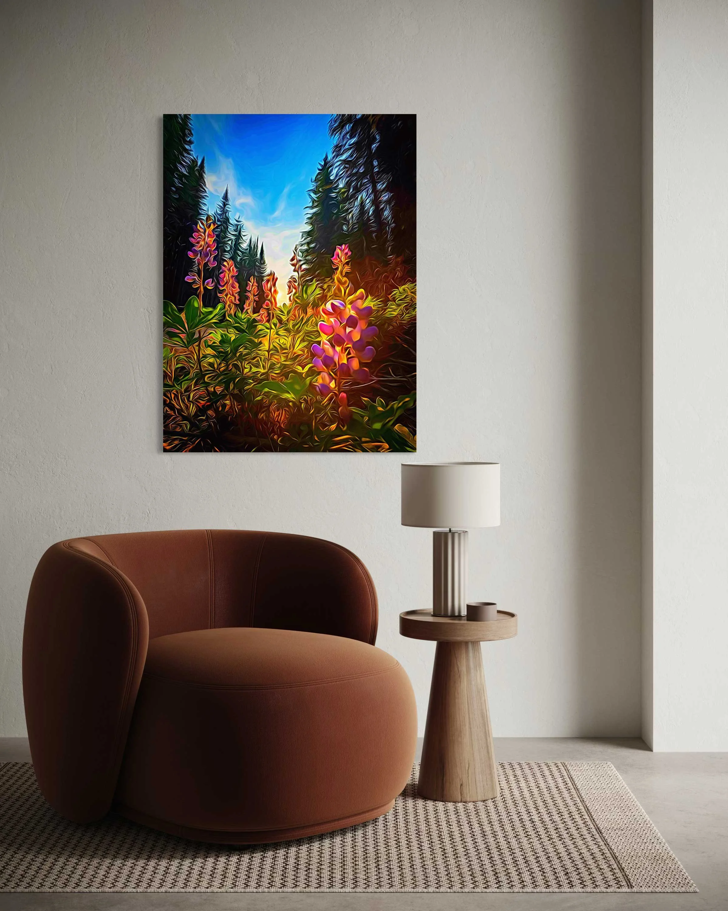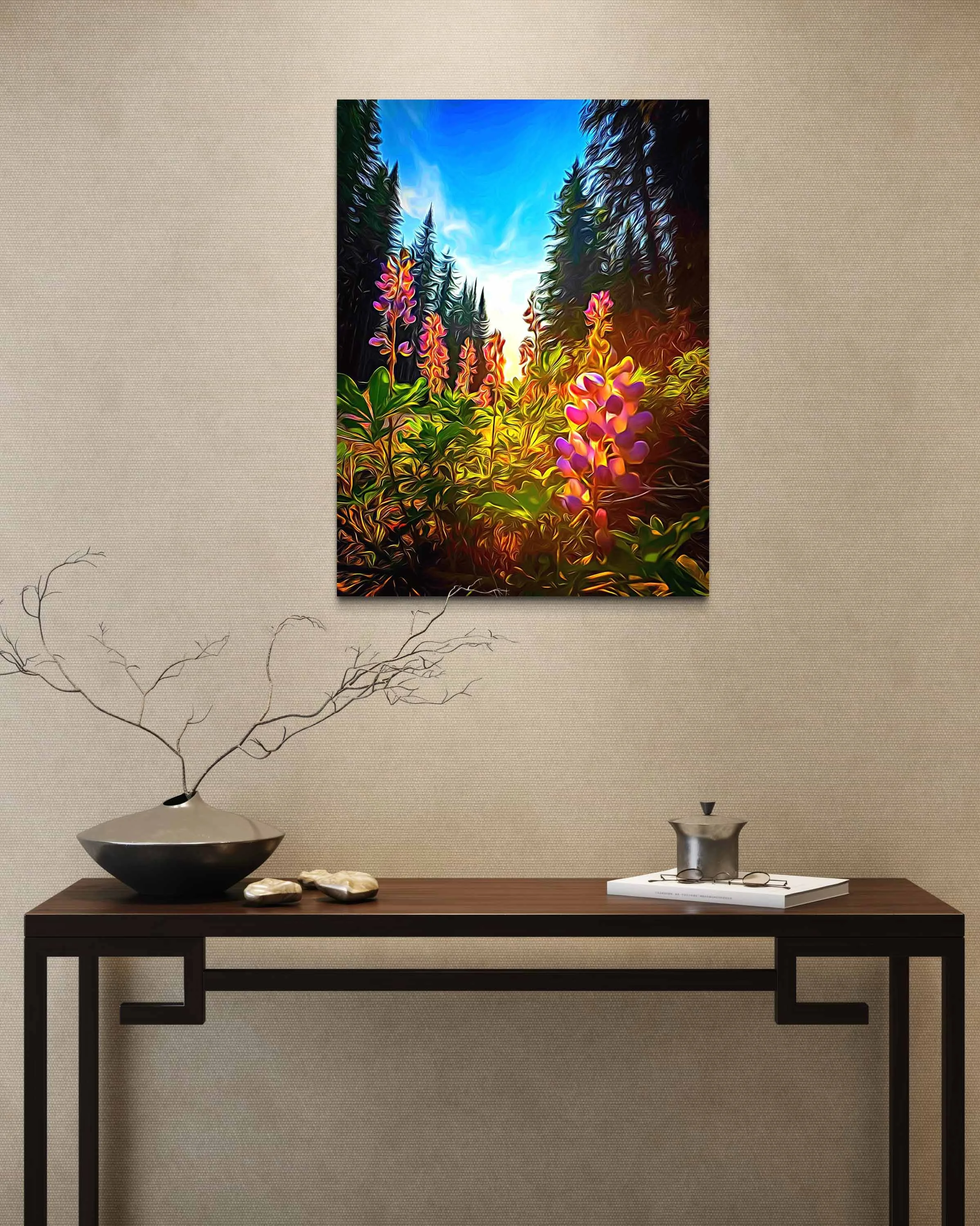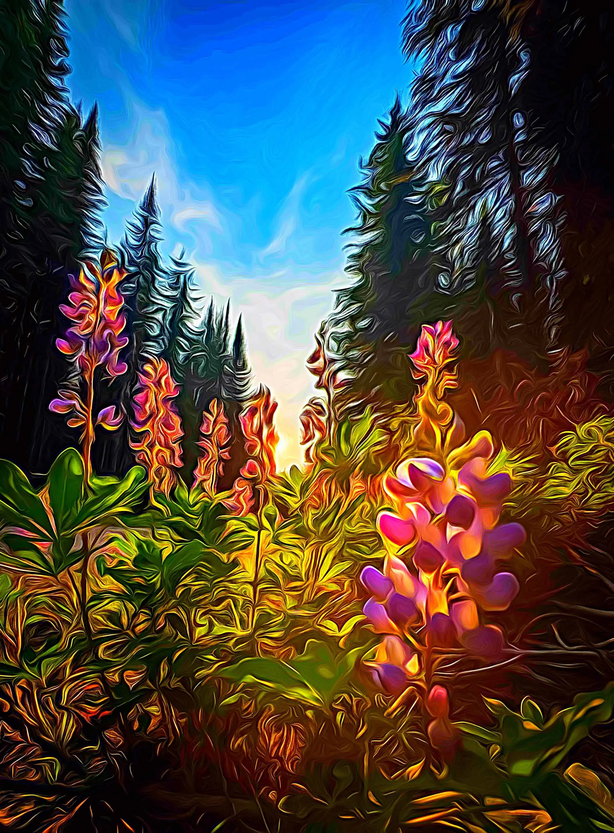 “Wild Lupins” - is based on a split-second moment of awe. I was biking back from McGillivray Lake when the light suddenly poured through the forest, catching the lupins just right. I slammed on the brakes, jumped off my bike, and crouched down into the glow. The painting preserves that exact feeling — the warm, golden light filtering between tall pines, igniting the pinks and purples of the lupins as if they were lit from within. The low viewpoint keeps me right where I was: kneeling in the soft undergrowth, breathing in the forest air, heart still racing from the ride and the beauty of the moment. It’s a memory made vivid — that perfect pause on a summer trail where nature asked me to stop, look closer, and feel completely alive.